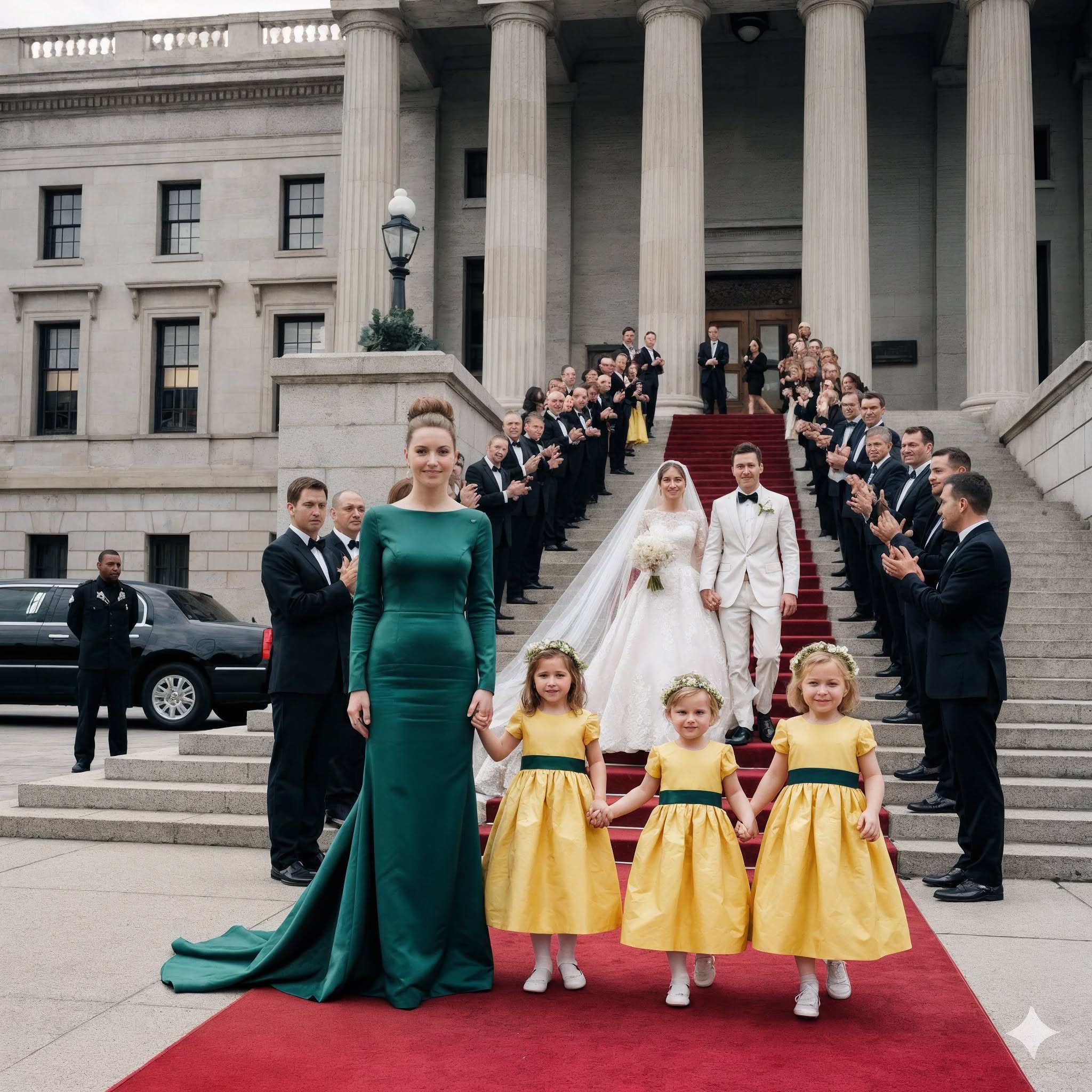 De ceremonie stond op het punt te beginnen toen het zachte gerommel van een limousine ieders aandacht trok. De zwarte auto parkeerde voor het hotel. De chauffeur opende de deur… en drie kleine meisjes stapten uit, gekleed in gele jurkjes, hand in hand als drie zonnestralen.