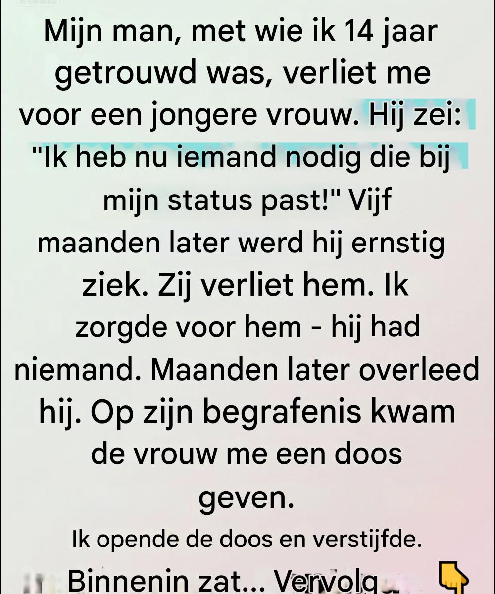 ‘Ik ben hier te groot voor geworden,’ zei hij, terwijl hij om zich heen keek naar het leven dat we samen hadden opgebouwd. ‘Ik heb iemand nodig die past bij de richting die ik op wil.’