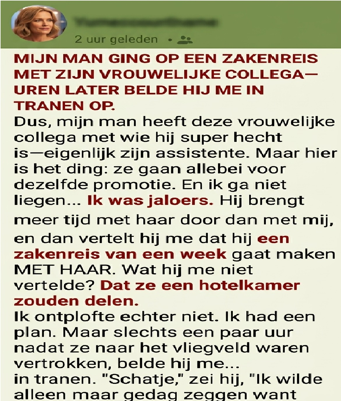Maar na verloop van tijd stapelden de problemen zich op. Cameron bracht meer tijd met haar door dan met mij. Late vergaderingen. « Snel een drankje » na het werk. Conferenties die ze « moesten » bijwonen. Dus toen hij op een avond thuiskwam en terloops een vierdaagse zakenreis met Lucy noemde, voelde ik die bekende steek in mijn maag. Hij zag er nerveus uit, alsof hij al wist wat ik zou vragen.