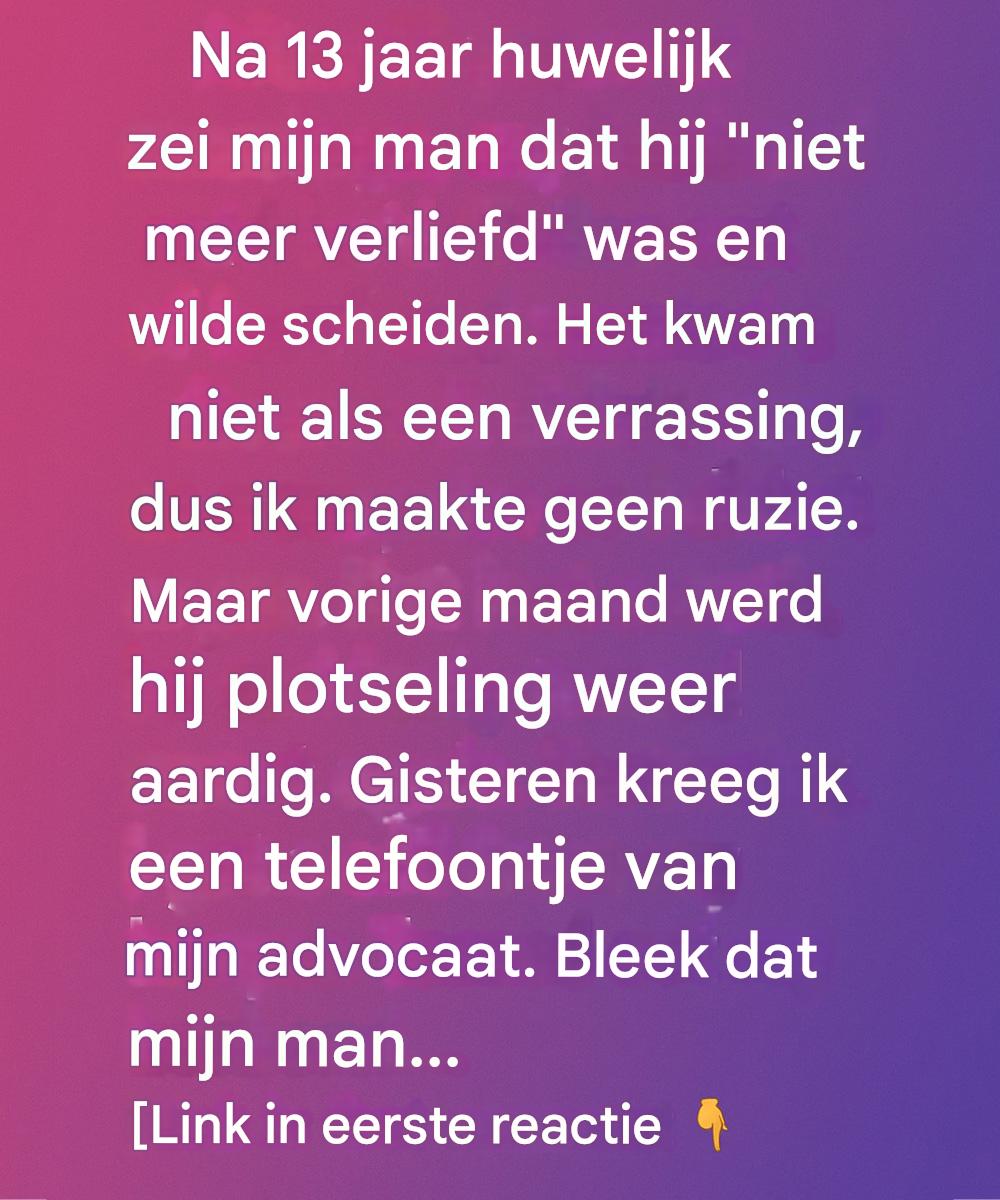 Na 13 jaar huwelijk vertelde mijn man me dat hij niet meer verliefd op me was en wilde scheiden.