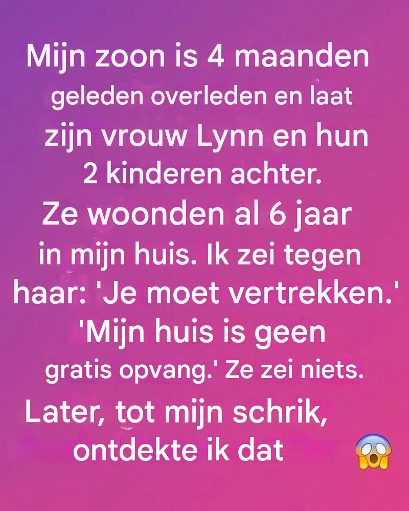 Ze woonden zes jaar in mijn huis. Toen hij nog leefde, voelde ik me nooit overweldigd – mijn huis was hun thuis. Maar na zijn dood sloeg mijn verdriet om in frustratie. Ik voelde de stilte in huis, overal herinneringen aan hem, en op een dag brak ik. Ik zei tegen Lynn: « Je moet gaan. Mijn huis is geen vrijhaven. » Ze zei niets. Geen protest, geen woede, alleen stilte. Ze omhelsde haar kinderen, haar gezicht bleek maar kalm. Op dat moment verwarde ik haar stilte met onverschilligheid, terwijl ze in werkelijkheid een veel grotere pijn met zich meedroeg dan de mijne.