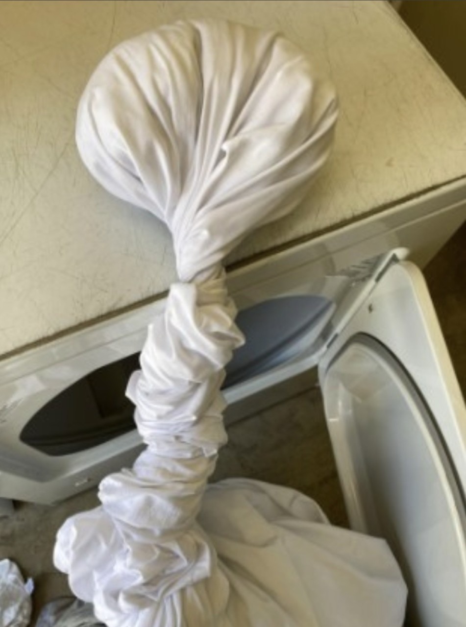 Terwijl de droger draait, verandert die klomp in een enorme, gedraaide knoop.