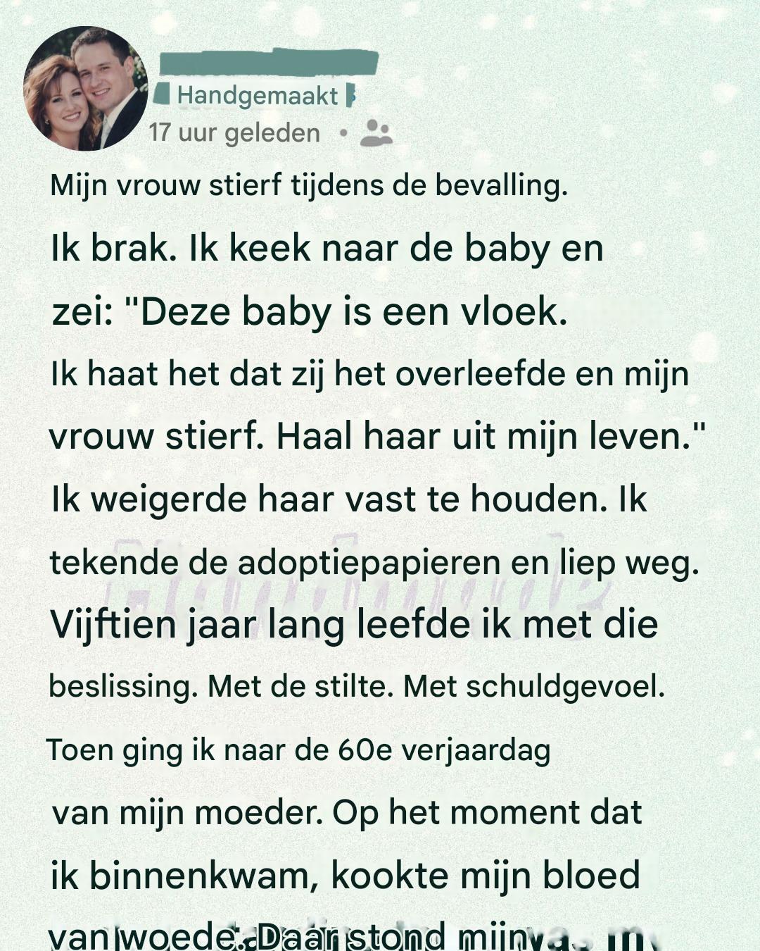 Ik weigerde haar vast te houden. Ik weigerde zelfs nog naar haar te kijken. Ik tekende de adoptiepapieren met een trillende hand, niet van twijfel, maar van woede. Toen liep ik weg. Vijftien jaar stilte volgden. Vijftien jaar van schuldgevoel dat aan me knaagde als een parasiet. Ik leefde, maar ik leefde niet echt. Ik werkte, ik at, ik sliep, maar elke ademhaling droeg de last van verlatenheid. Ik had mijn dochter veroordeeld tot een leven zonder mij, en ik geloofde dat ik mezelf had veroordeeld tot een leven zonder verlossing.