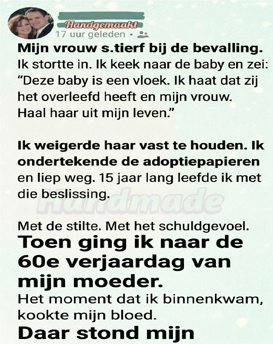 Ik weigerde haar vast te houden. Ik weigerde zelfs nog naar haar te kijken. Ik tekende de adoptiepapieren met een trillende hand, niet van twijfel, maar van woede. Toen liep ik weg. Vijftien jaar stilte volgden. Vijftien jaar van schuldgevoel dat aan me knaagde als een parasiet. Ik leefde, maar ik leefde niet echt. Ik werkte, ik at, ik sliep, maar elke ademhaling droeg de last van verlatenheid. Ik had mijn dochter veroordeeld tot een leven zonder mij, en ik geloofde dat ik mezelf had veroordeeld tot een leven zonder verlossing.
