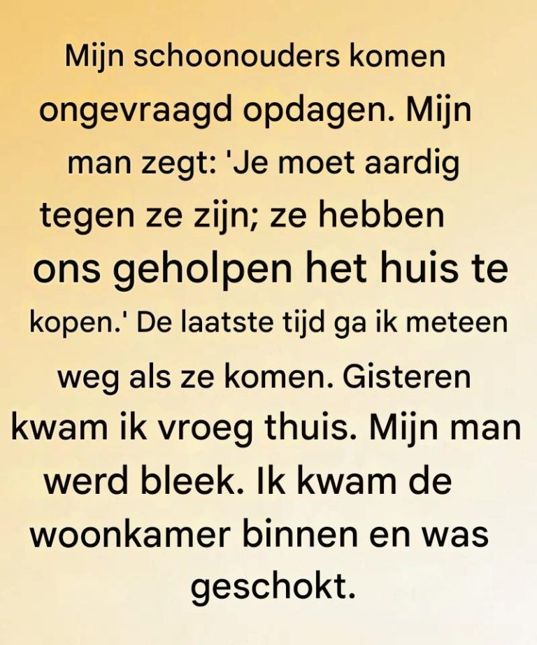 Omdat we er al waren, waren we niet enthousiast. Mijn man herinnert me het doel: « Heb geduld. Ze hebben ons geholpen dit huis te kopen. » Hoewel ik hun vrijgevigheid waardeerde, verlangde ik nog steeds naar meer grenzen.