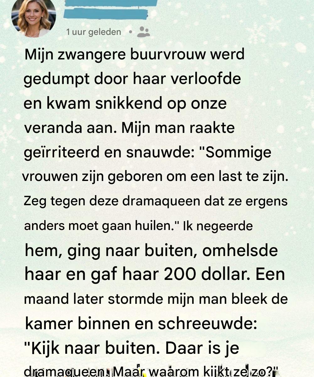 Ik herkende haar meteen. We waren nooit echt close geweest – alleen beleefde glimlachen in het voorbijgaan, af en toe een knikje. Ze was stil en teruggetrokken. Ik had nog geen idee wat er gebeurd was, maar het was duidelijk dat er iets in haar leven was ingestort. Ik leidde haar voorzichtig naar de bank op de veranda en sloeg mijn armen om haar heen. Ze beefde in mijn omhelzing, het soort beven dat je krijgt als je het te lang hebt volgehouden en het uiteindelijk begeeft. Ze rook vaag naar regen en zeep.