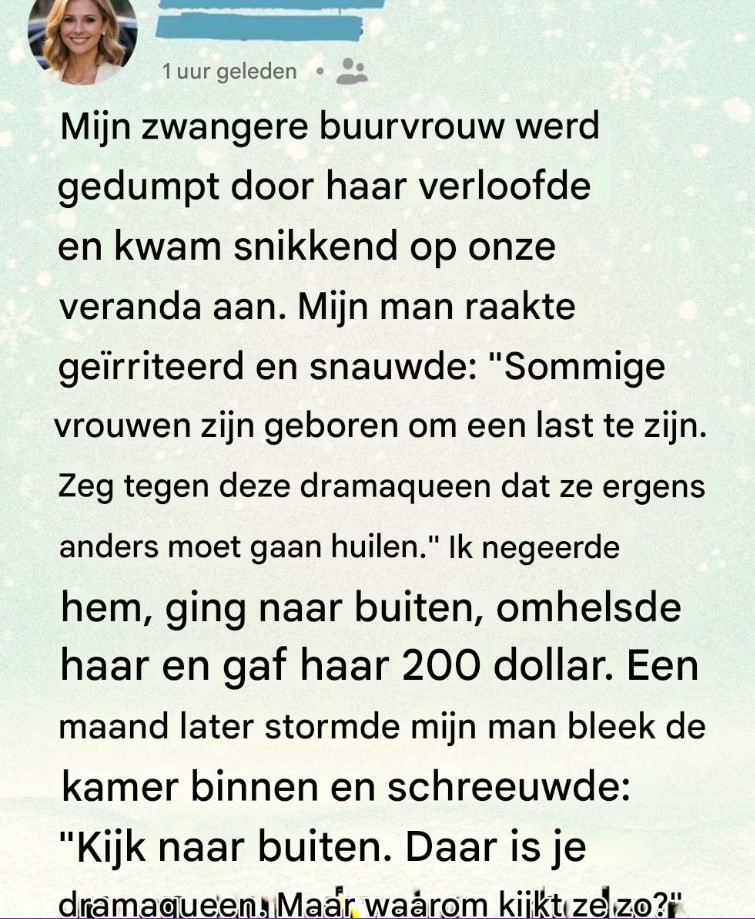 Ik herkende haar meteen. We waren nooit echt close geweest – alleen beleefde glimlachen in het voorbijgaan, af en toe een knikje. Ze was stil en teruggetrokken. Ik had nog geen idee wat er gebeurd was, maar het was duidelijk dat er iets in haar leven was ingestort. Ik leidde haar voorzichtig naar de bank op de veranda en sloeg mijn armen om haar heen. Ze beefde in mijn omhelzing, het soort beven dat je krijgt als je het te lang hebt volgehouden en het uiteindelijk begeeft. Ze rook vaag naar regen en zeep.