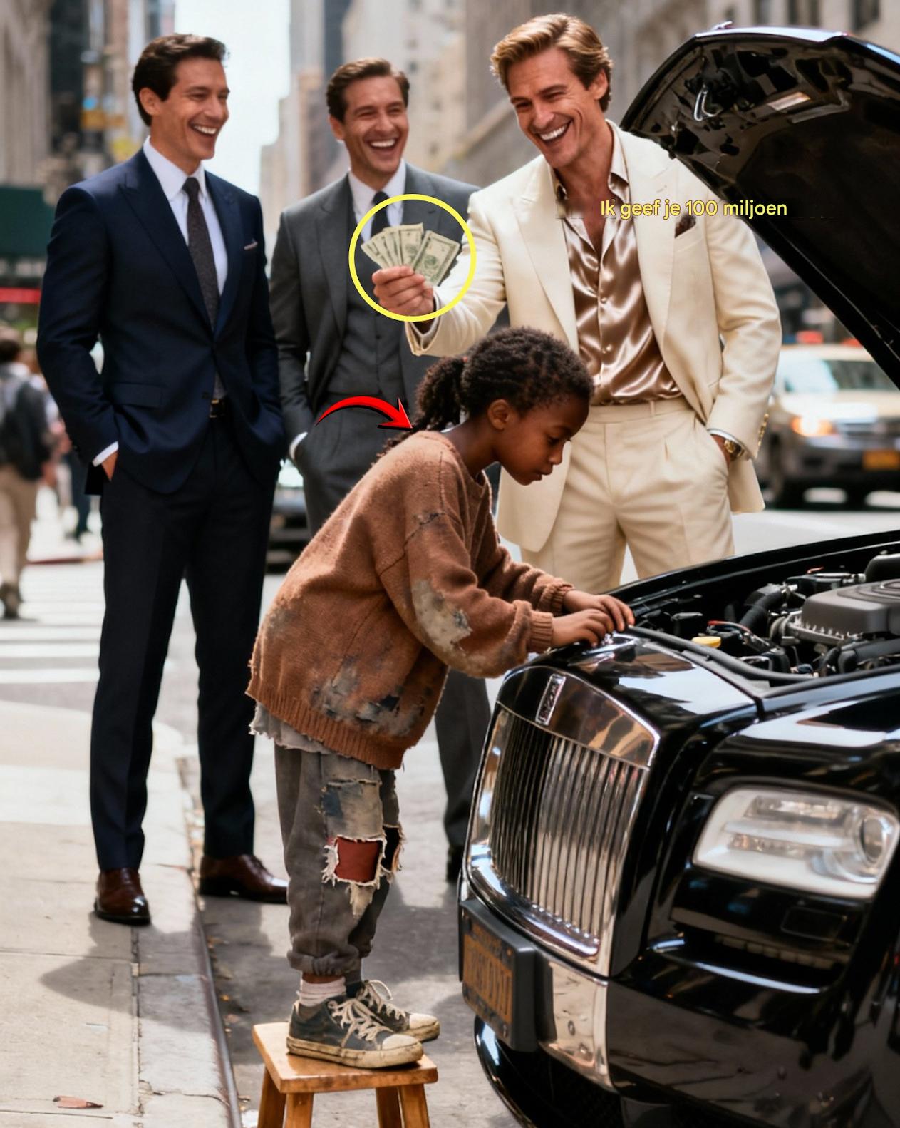 ‘Ik geef je 100 miljoen als je mijn auto repareert.’ De miljardair lachte, totdat een arm zwart meisje hem de schrik op het lijf joeg. Een witte miljardair in een lichtblauw pak lacht en wijst: ‘Ik geef je 100 miljoen dollar als je mijn auto repareert.’ Een arm zwart meisje in gescheurde, vuile kleren klimt op een krukje onder de open motorkap. Stil, bang, trillend.