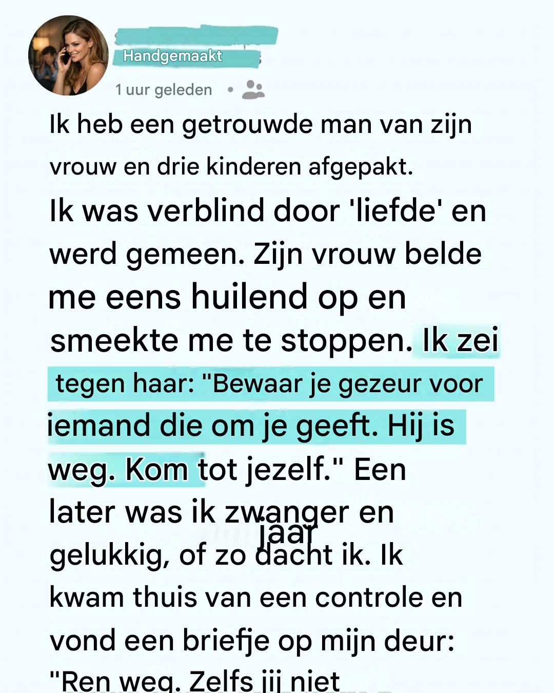 Ik herinner me haar stem nog steeds – trillend, hees, alsof ze urenlang had gehuild. Ze schreeuwde niet. Ze beledigde me niet. Ze smeekte. Ze vroeg me om te stoppen met haar man te zien, om aan haar kinderen te denken, om haar gezin de kans te geven te herstellen. Ze zei dat ze probeerde alles bij elkaar te houden en niet wist hoe lang ze het nog vol zou houden.