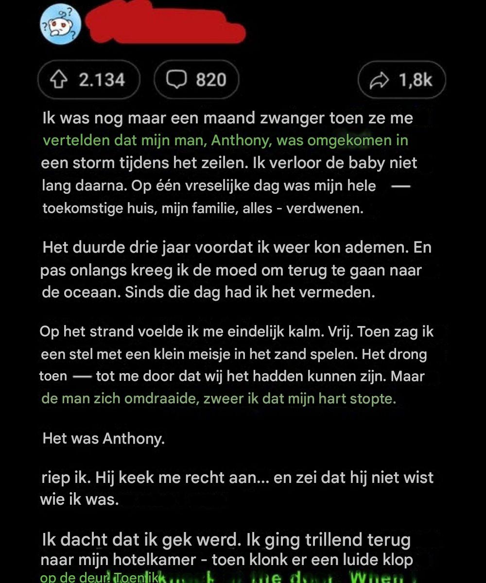 Anthony was die ochtend vertrokken en zei dat het slechts een kort visreisje was voordat de storm toesloeg. De horizon gloeide vurig rood – het soort waar zeelieden altijd bang voor zijn – maar hij kuste me alleen maar op mijn voorhoofd, glimlachte en zwoer dat het slechte weer hem nooit had geraakt. Die kus was het laatste moment dat we deelden.