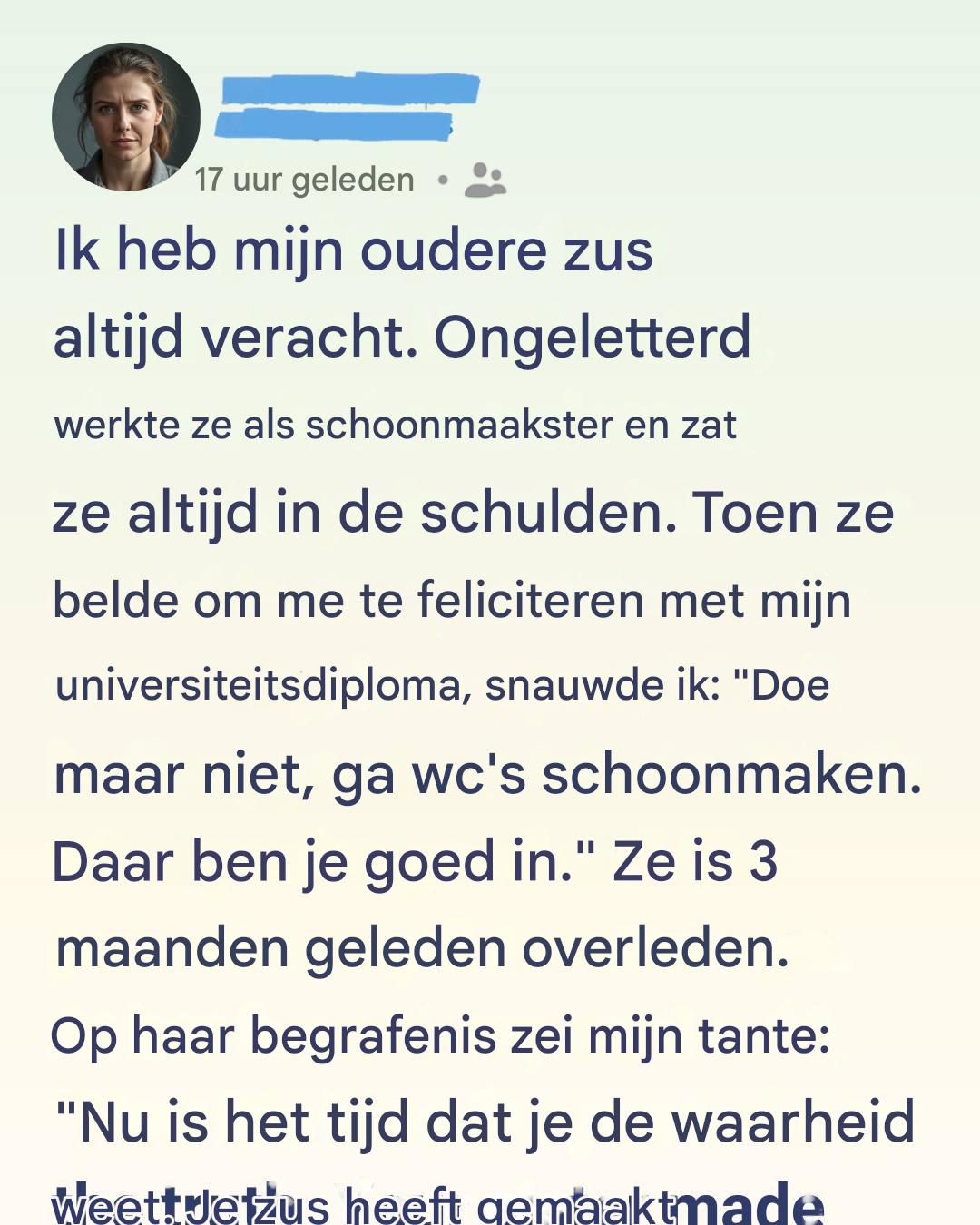 Mijn zus heeft dat verhaal nooit betwist. Ze heeft zich nooit verdedigd. Ze glimlachte gewoon – zachtjes, vermoeid – en ging verder.
