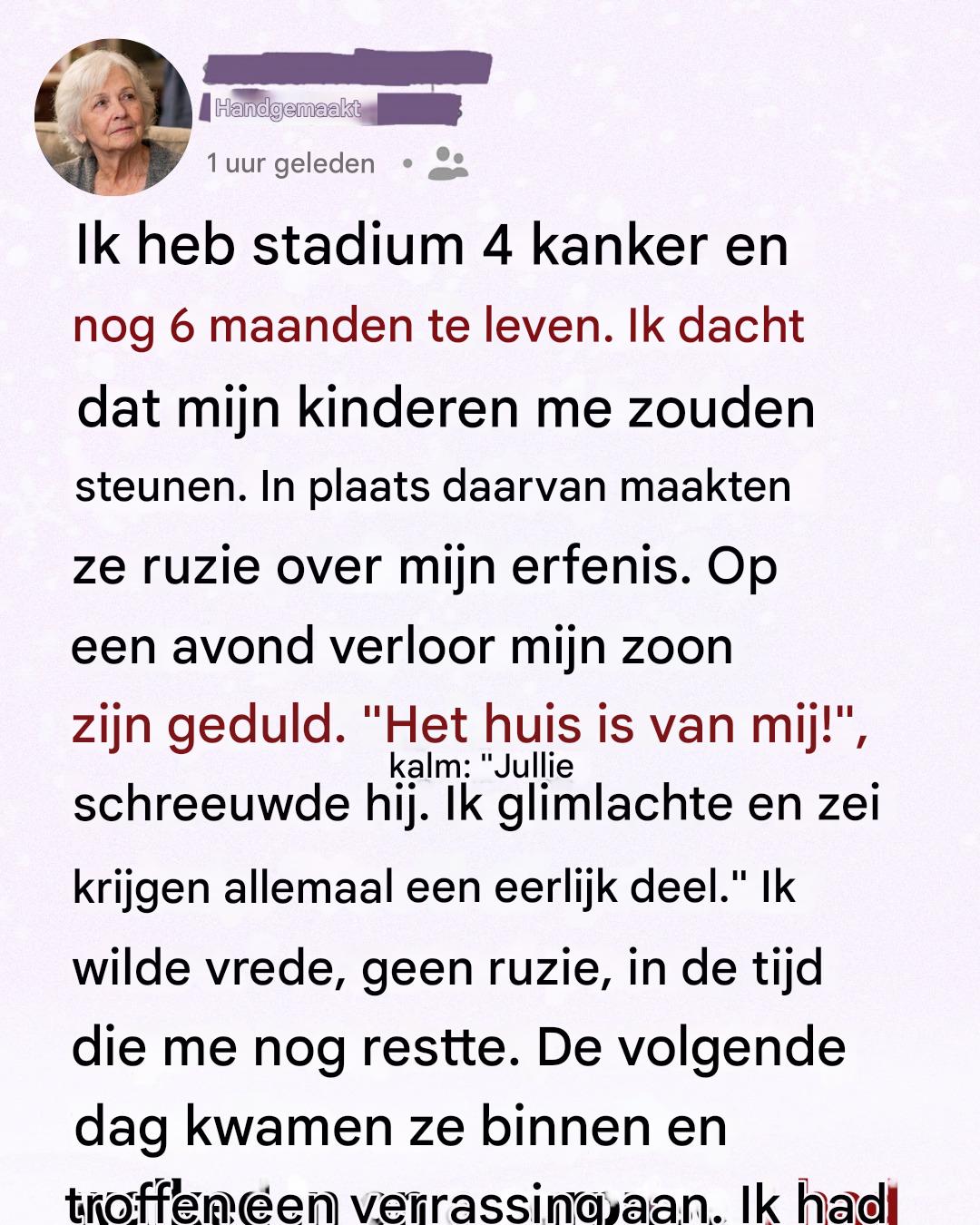 Mijn kinderen woonden vlakbij – slechts tien of vijftien minuten – maar bezoekjes waren al lang voor mijn ziekte een zeldzaamheid geworden. Deze afstand was niet ontstaan na mijn diagnose; ze was al jaren eerder begonnen, na het overlijden van mijn man. Na zijn begrafenis kwam de verantwoordelijkheid voor het contact volledig op mijn schouders terecht. Ik was degene die belde, degene die uitnodigingen verstuurde en degene die vocht om ons gezin bij elkaar te houden. Feestdagen werden gehaaste aangelegenheden, in de marge van hun andere plannen gepropt. Telefoontjes waren kort en afgeleid. Ik leerde dat als ik geen contact opnam, weken in maanden zouden veranderen zonder dat ik iets van ze hoorde.