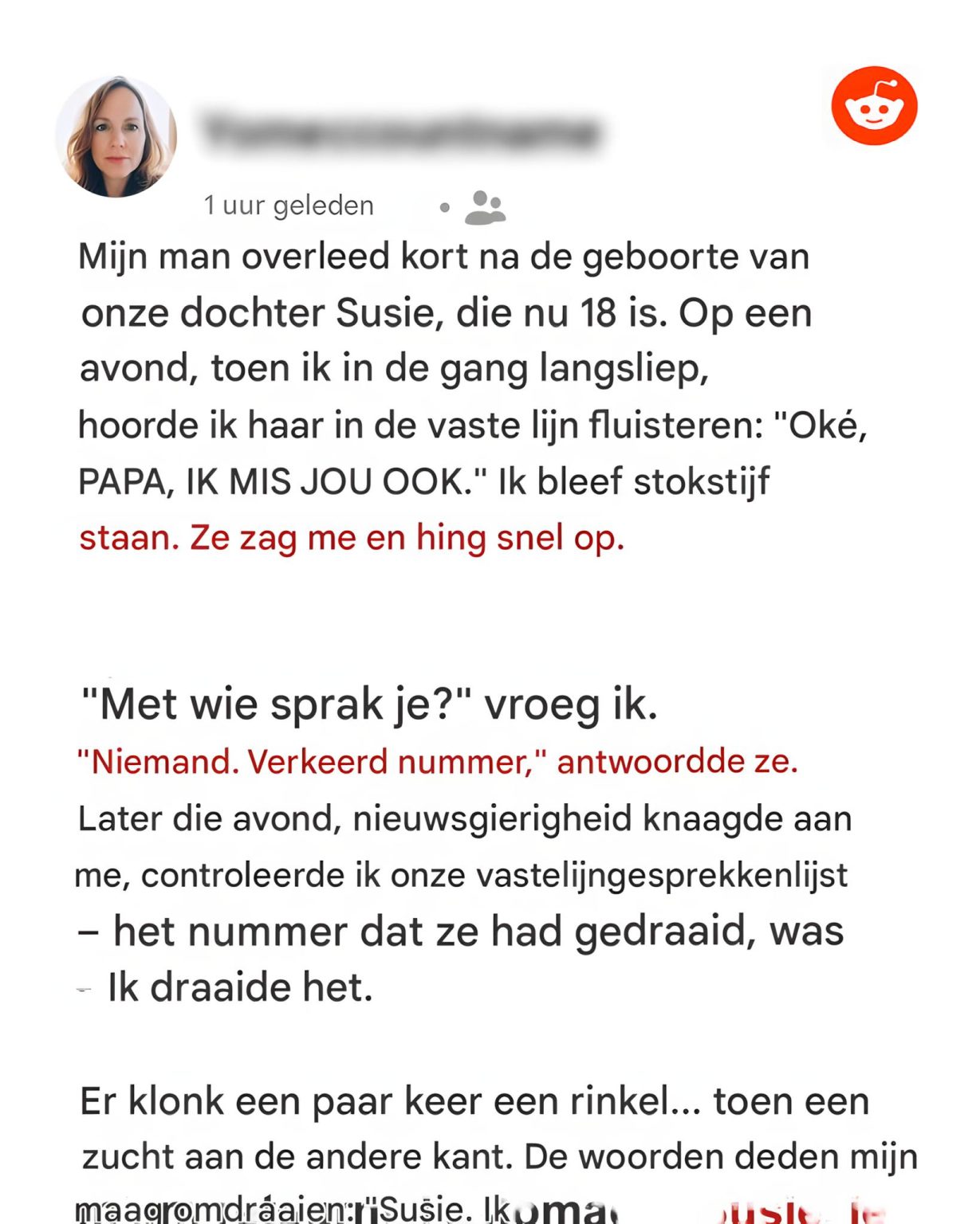 Ik hoorde mijn dochter fluisteren « Ik mis je, papa » aan de telefoon – ik heb haar vader 18 jaar geleden begraven