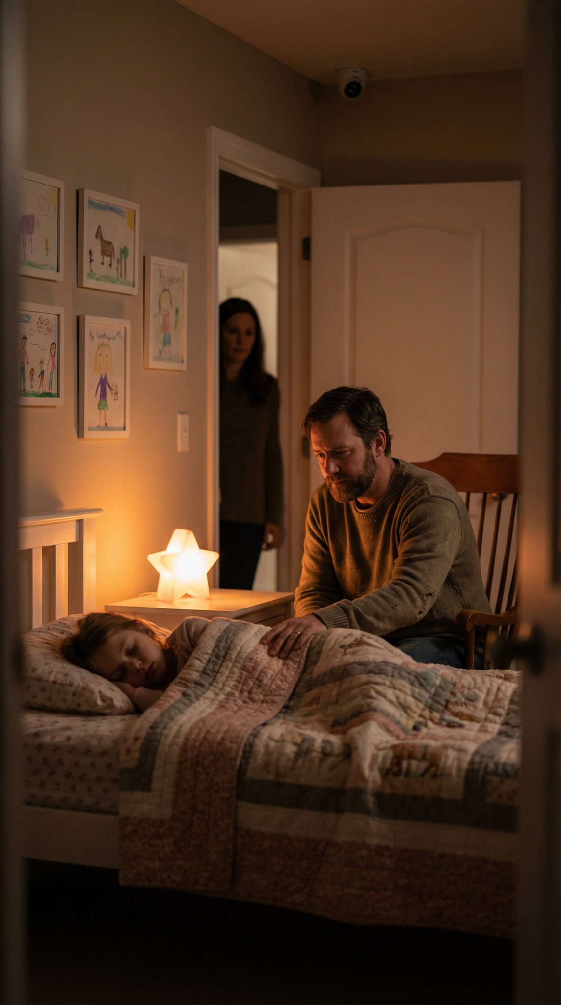 De deur stond een klein beetje open. Een zacht oranje nachtlampje scheen door de kier.