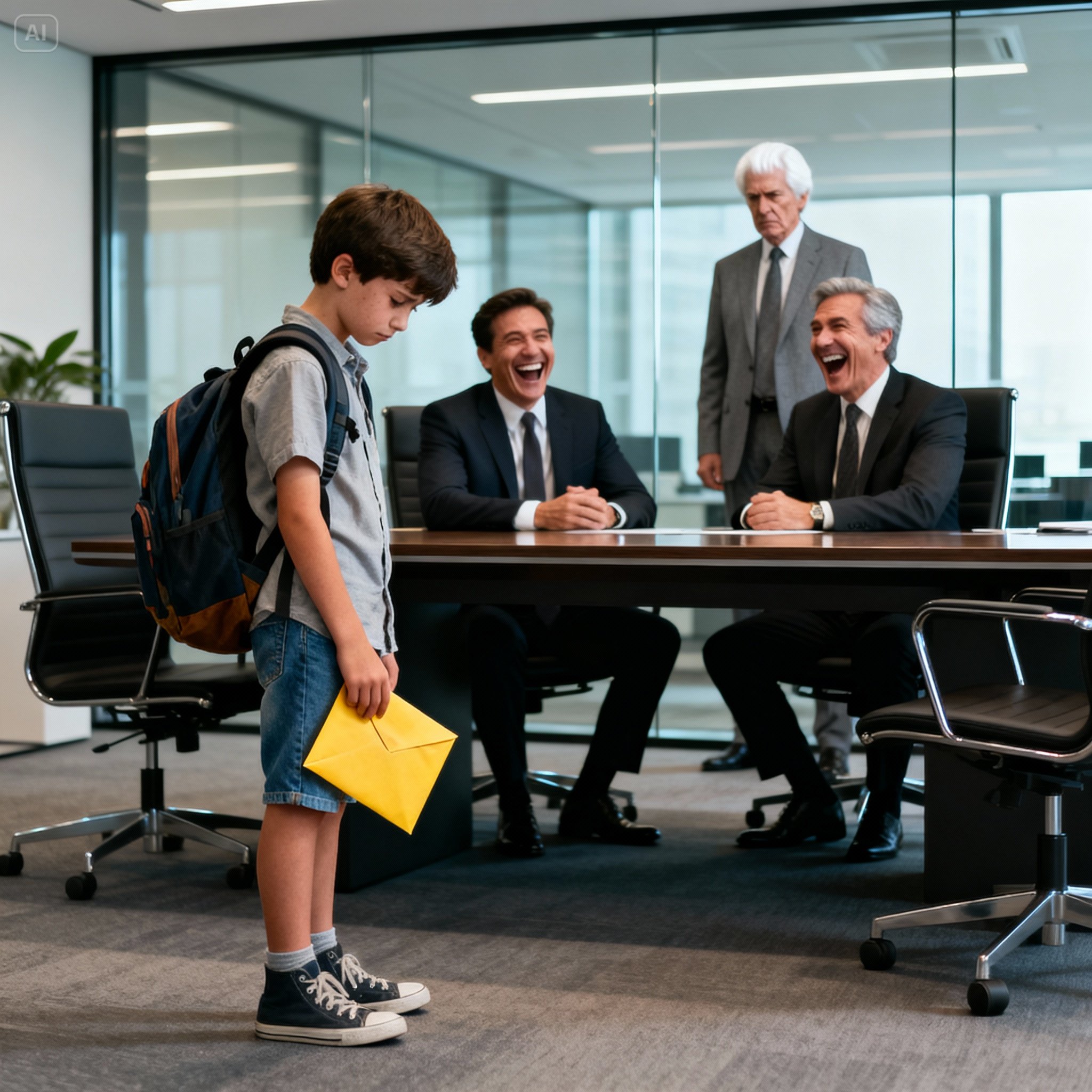 Lucas Ferreira klemde een gele envelop tegen zijn borst terwijl hij de glazen deur van het gebouw opende. Zijn handen waren bezweet, niet door het gewicht van de envelop, maar door de enorme omvang van de plek. Alles was van marmer, glas en dure pakken. Om hem heen haastten volwassenen zich voorbij, schijnbaar onbewust van de rest. Mensen zoals hij, een tienjarige jongen met versleten sneakers en een gescheurde rugzak, waren er simpelweg onzichtbaar.