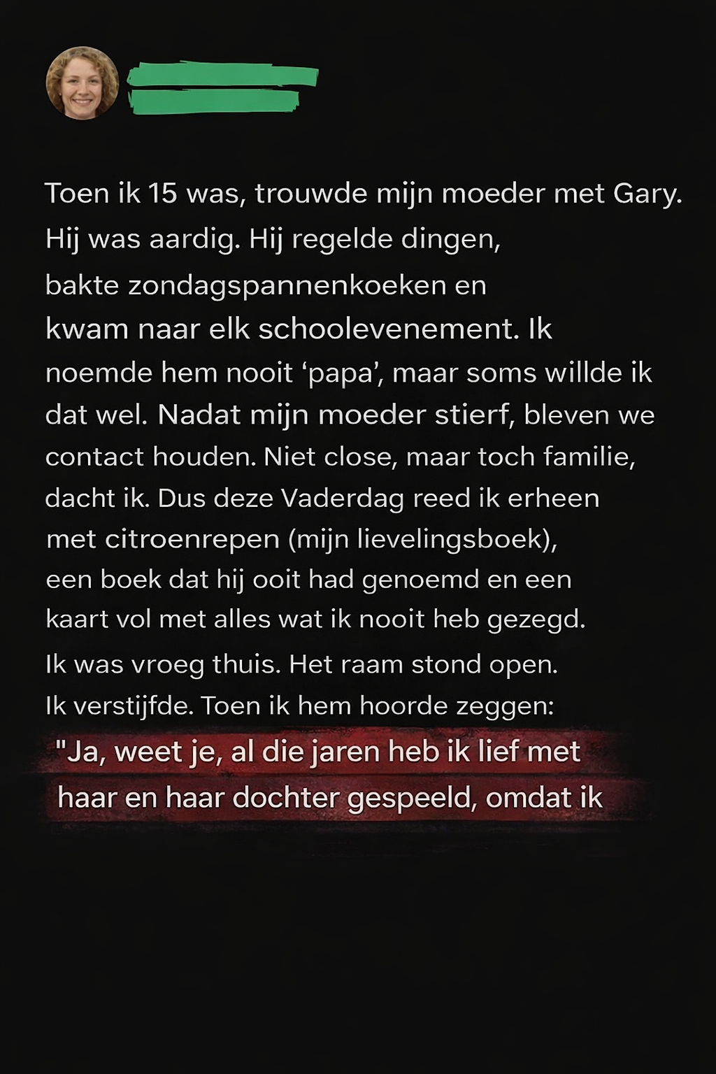 Ik dacht dat ik thuiskwam om een hoofdstuk af te sluiten. Om eindelijk de man te bedanken die binnenkwam toen mijn vader naar buiten stapte. Maar wat ik in plaats daarvan vond, verbrijzelde alles wat ik geloofde over de man die ik bijna papa noemde.