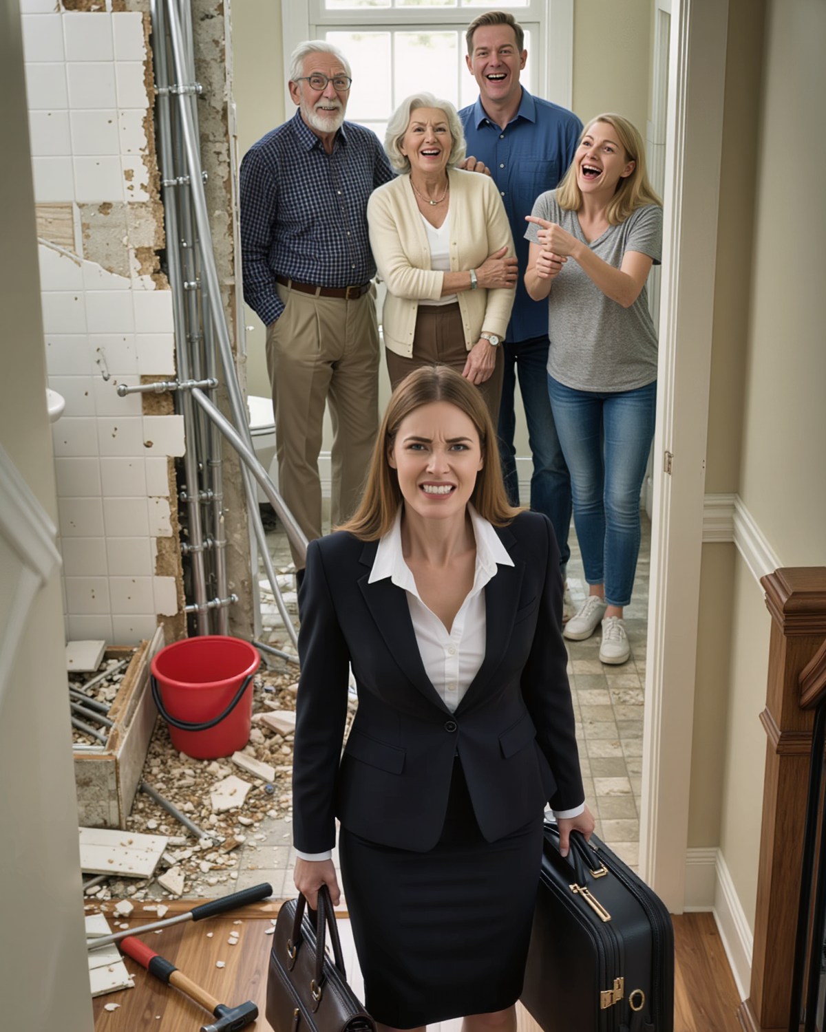 En middenin al die drukte: mijn zus Emily, haar man Rick en zijn ouders, breed lachend alsof het een familieproject was.
