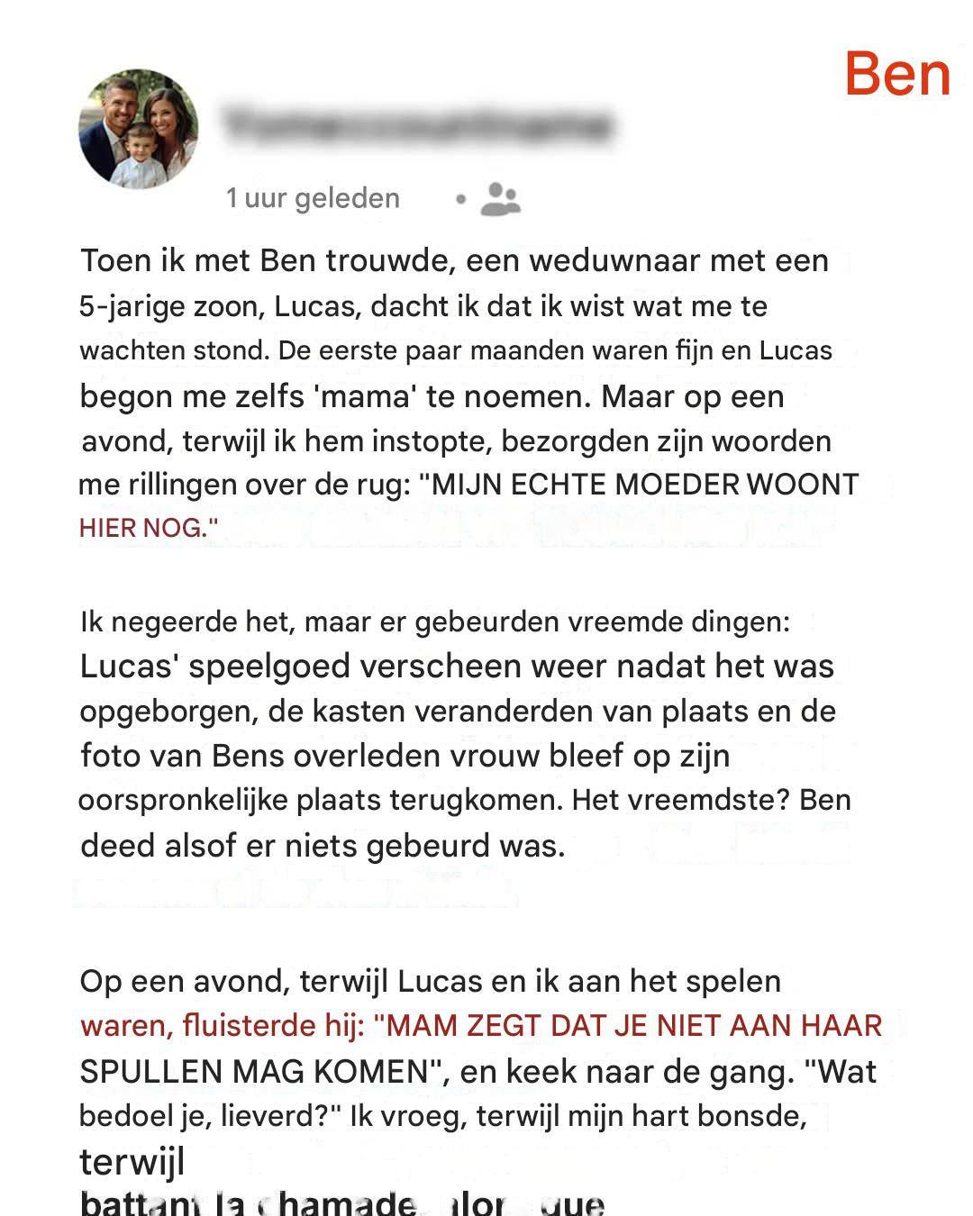 Op een avond, na een gezellige avond, stopte ik Lucas in bed. Nu kunt u het onmiddellijk openen. “Weet je, mijn echte moeder woont hier nog steeds,” fluisterde hij.