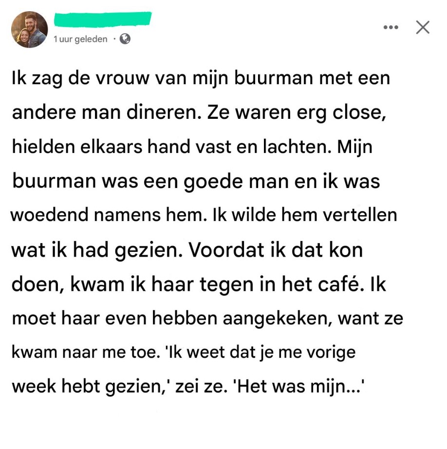 Er zijn momenten waarop je het gevoel hebt dat je een missie hebt. Jij bent degene die ziet, die begrijpt, die moet handelen. Die avond, in een klein Italiaans restaurantje in mijn buurt, was ik ervan overtuigd dat ik aan de goede kant van de geschiedenis stond. Terwijl mijn vork boven mijn bord zweefde, zag ik de vrouw van mijn buurman, Camille, tegenover een vreemde zitten. Hun handen raakten elkaar aan. Ze lachte zachtjes. Té zachtjes.
