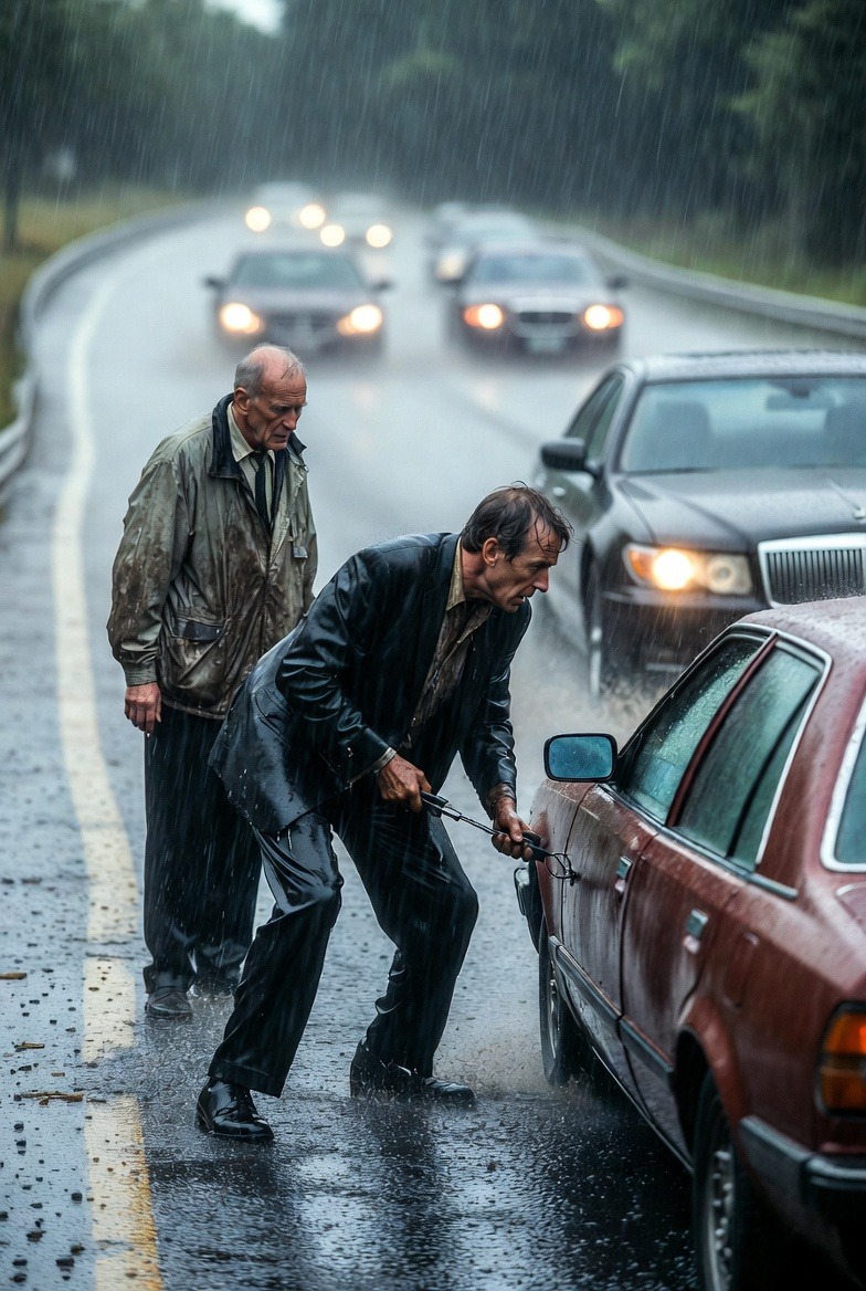 Vlakbij stond een oude man, verscholen onder een dunne windjack, te vechten tegen de wind. Hij probeerde een bandenlichter los te draaien, maar die zag er fragiel uit. Een vrouw, die op de passagiersstoel zat, leek doodsbang.