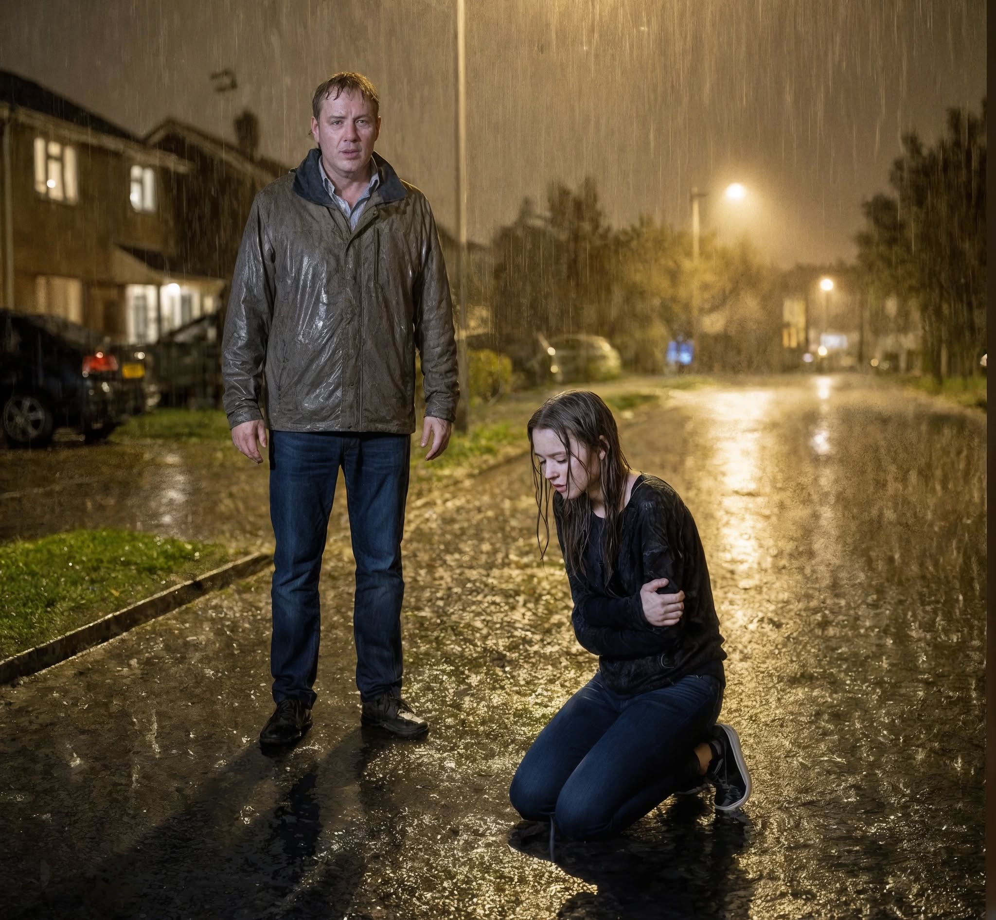 De regen viel met bakken uit de hemel toen ik de straat insloeg die naar het huis van mijn dochter leidde. Ik was niet van plan haar te bezoeken; ik zou alleen een pakketje afgeven dat per ongeluk op mijn adres was bezorgd. Maar toen zag ik haar – Emily – knielend op de oprit, doorweekt, rillend, haar handen tegen het beton gedrukt alsof ze gedwongen was te bidden. Het water stroomde langs haar gezicht, vermengd met strepen mascara, en even dacht ik dat ze gevallen was. Maar zodra ze haar hoofd optilde en terugdeinsde, wist ik het.