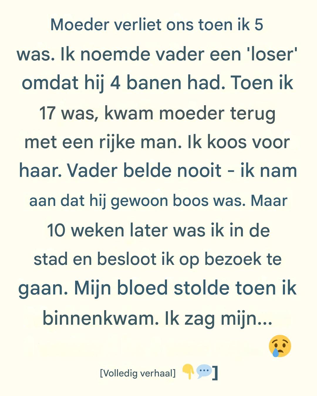 Mijn vader had vier banen. Vier uitputtende, ondankbare banen. Hij verliet het huis voordat de zon opkwam en kwam pas lang na zonsondergang terug, zijn kleren stinkend naar vet, zweet en goedkope koffie. Zijn handen waren altijd ruw, zijn schouders permanent gebogen, zijn ogen dof van vermoeidheid. En toch, ondanks al dat werk, waren we nog steeds arm. De koelkast was vaak halfleeg. Mijn kleren kwamen uit kringloopwinkels. Ik zag andere kinderen pronken met hun nieuwe schoenen en speelgoed, en langzaam begon er wrok in me te groeien.