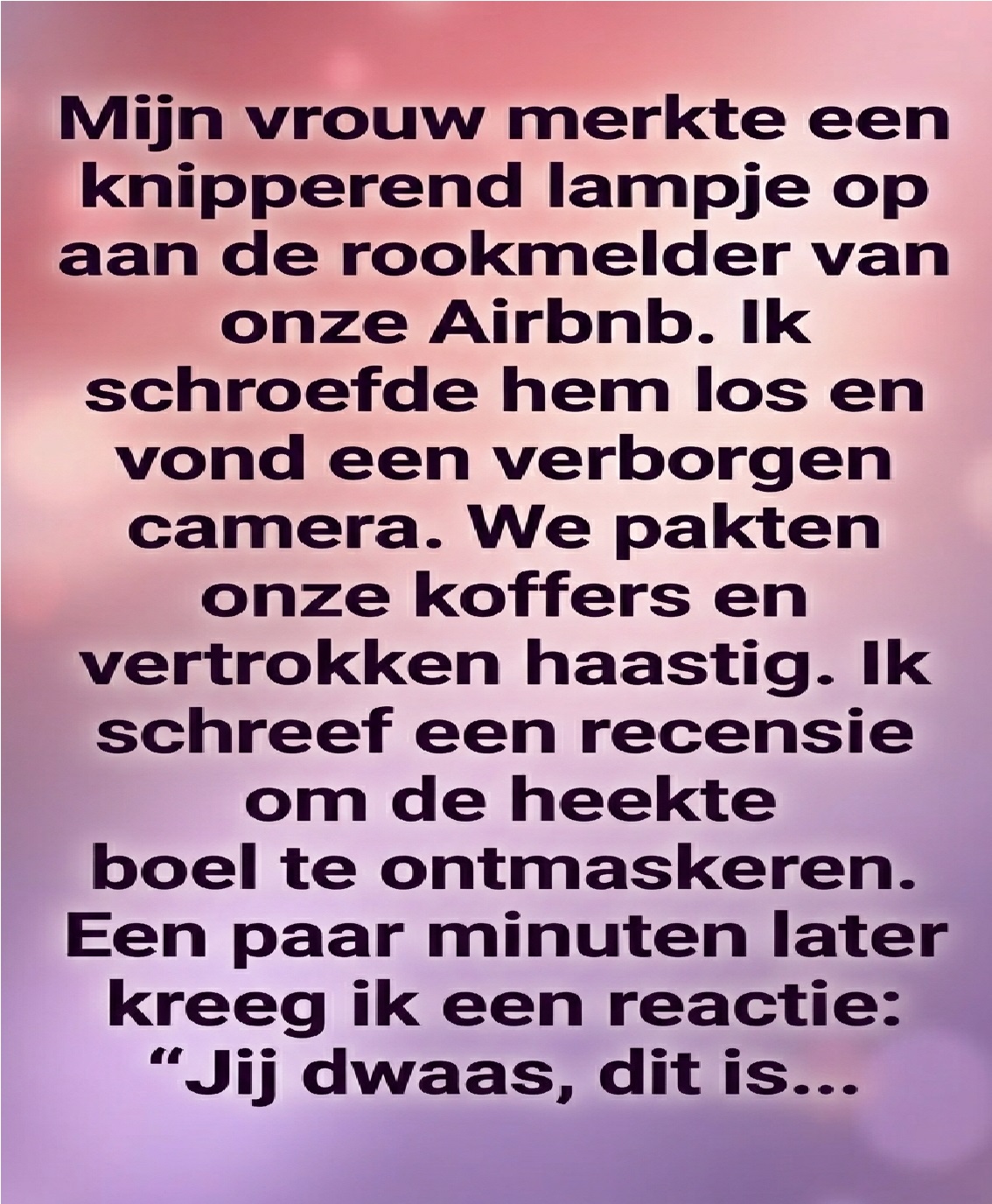 Tijdens een verblijf in een Airbnb trok een ogenschijnlijk onschuldig knipperend lampje op de rookmelder de aandacht van de vrouw van de verteller. Nieuwsgierig en bezorgd klom hij naar boven om het te inspecteren – en wat hij aantrof joeg hem de stuipen op het lijf. In het apparaat zat iets wat leek op een verborgen cameralens.