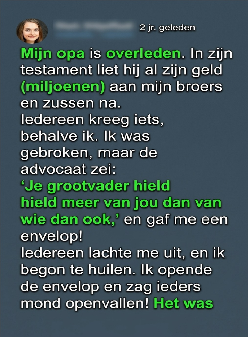 Ik opende het, en daarin zat een brief. Niet van de advocaat. Niet van de beheerder van de nalatenschap. Van opa.
