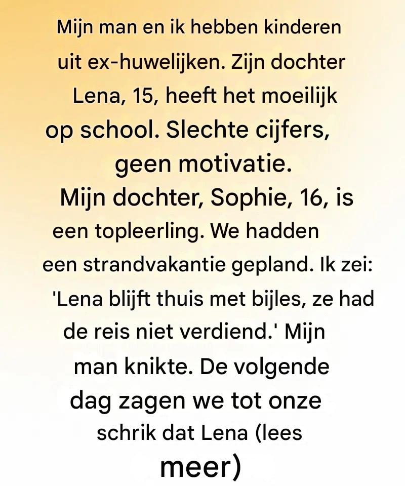 Toen we een strandvakantie met het gezin planden, zei ik: « Lena moet thuisblijven en met haar docenten werken. Ze heeft de reis niet verdiend. »