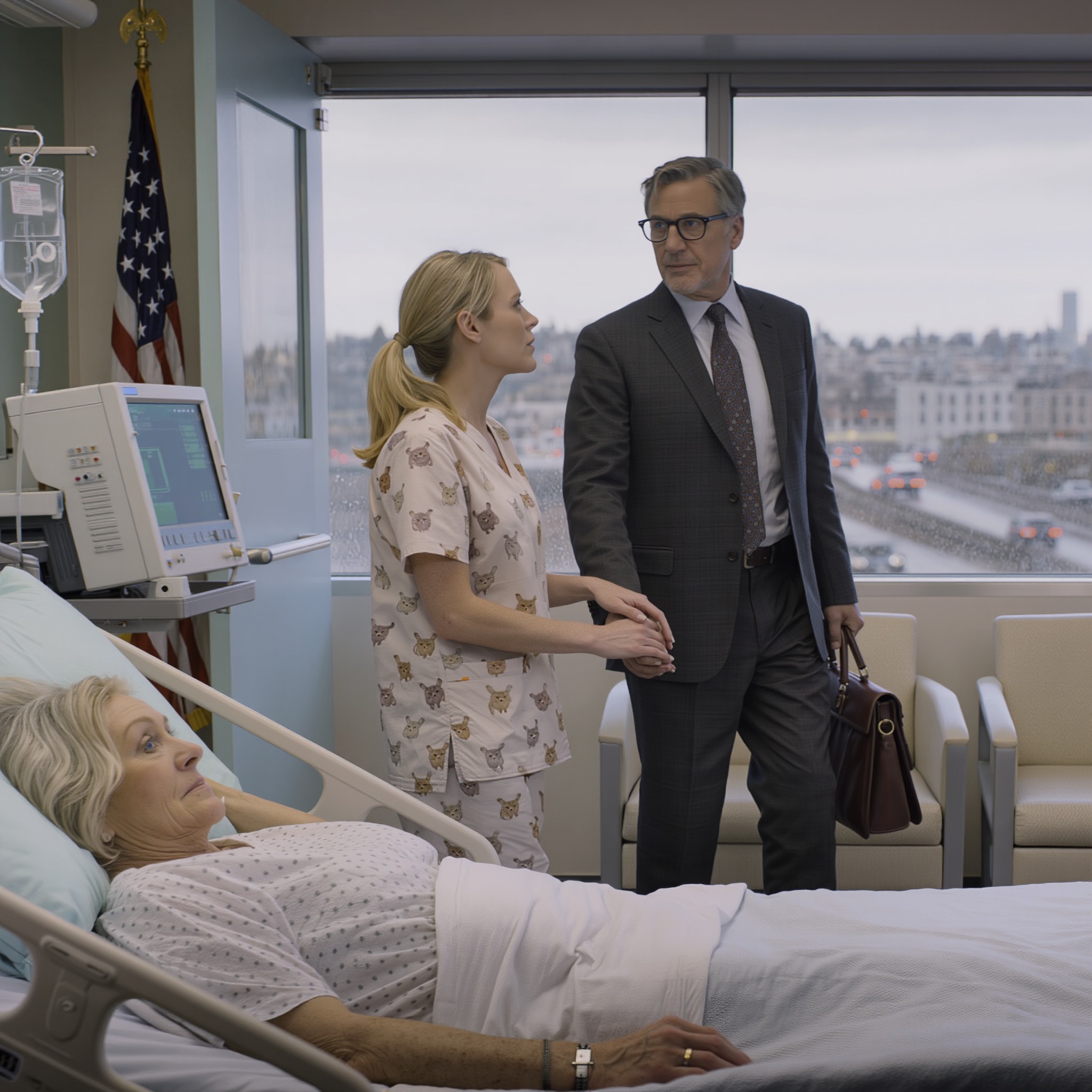 Ik werd na de operatie alleen wakker. De verpleegster zei: « Uw kinderen zijn vertrokken. Ze zeiden dat parkeren te duur was. » Ik barstte in tranen uit. Plotseling kwam er een lange man in een pak binnen en pakte voorzichtig mijn hand vast.