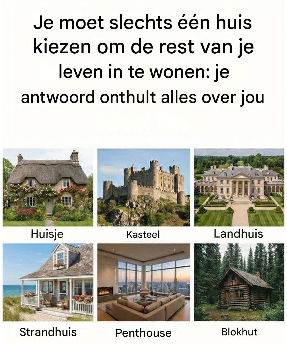 Op het eerste gezicht lijkt deze vraag simpel, bijna speels. Een cottage, een kasteel, een landhuis, een strandhuis, een penthouse of een blokhut. Slechts één keuze. Maar de waarheid is dat het huis waar je je toe aangetrokken voelt veel meer over jou zegt dan alleen je smaak in architectuur. Het weerspiegelt je waarden, je emotionele behoeften en hoe je je plaats in de wereld ziet.
