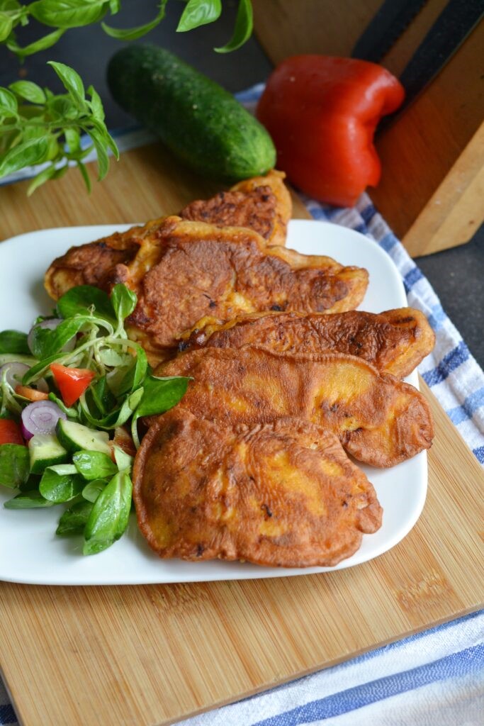 Kipfilet in ketchupbeslag is een idee voor een smakelijk gerecht met kipfilet. Het is eenvoudig te bereiden en deze schnitzels zijn lekker voor zowel kinderen als volwassenen. Het is voldoende om de kipfilet in kleinere stukken te snijden, op smaak te brengen en vervolgens in een pannenkoekenbeslag met ketchup, mayonaise en mosterd te wentelen. Het is belangrijk dat het beslag voor kipfilet in ketchupbeslag dik is, anders loopt het van het vlees af. Daarom moet er indien nodig meer of minder bloem worden toegevoegd dan in het recept staat. We kunnen het gesneden vlees naar wens kruiden; dit kan een kant-en-klare kipkruiden zijn, of zoals ik het doe – traditioneel zout, peper en paprikapoeder. Hetzelfde geldt voor het beslag: ik heb pittige ketchup en scherpe mosterd toegevoegd, maar milde ketchup en mosterd zijn ook lekker. Dit hangt af van onze smaakvoorkeuren. Op deze manier bereide kipfilet in ketchupbeslag is zacht en sappig van binnen en knapperig van buiten. Ze smaken heerlijk met gebakken aardappelen of friet en rauwkost. We kunnen ze als lunchgerecht in zo’n set serveren. Als we het vlees echter in kleinere stukken snijden, kan kipfilet in ketchupbeslag een smakelijke snack zijn voor een feestje.