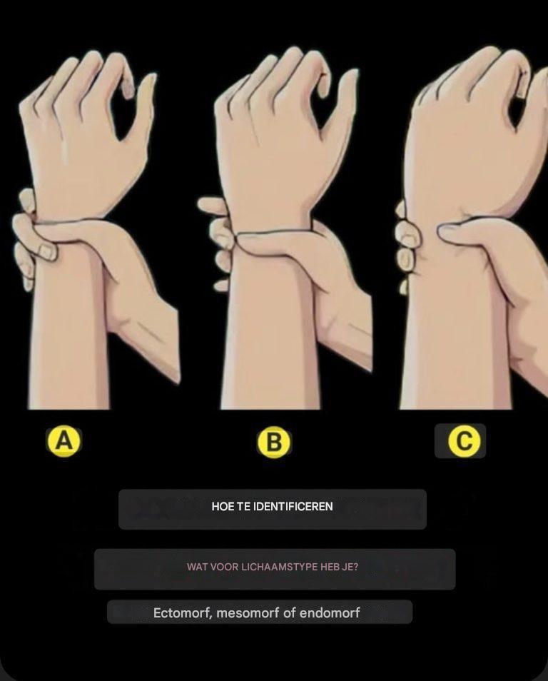 A – Ectomorf: Le pouce et le majeur se chevauchent largement lorsque vous enroulez votre autour de l’autre main. Het type is over het algemeen kenmerkend voor onze vinnen, de leden zijn lang en moeilijk bij het poids of de spiermassa.