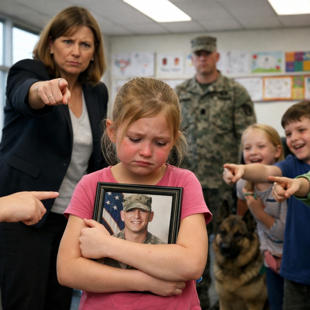 In de presentatiemap zat meer dan alleen papier; het was Emily’s hart dat blootgelegd werd. Tekeningen die ze zelf had gemaakt: een afbeelding van haar vader in camouflagekleding, een kleine Amerikaanse vlag in de hoek, en naast hem een grote, donkere vorm met puntige oren.