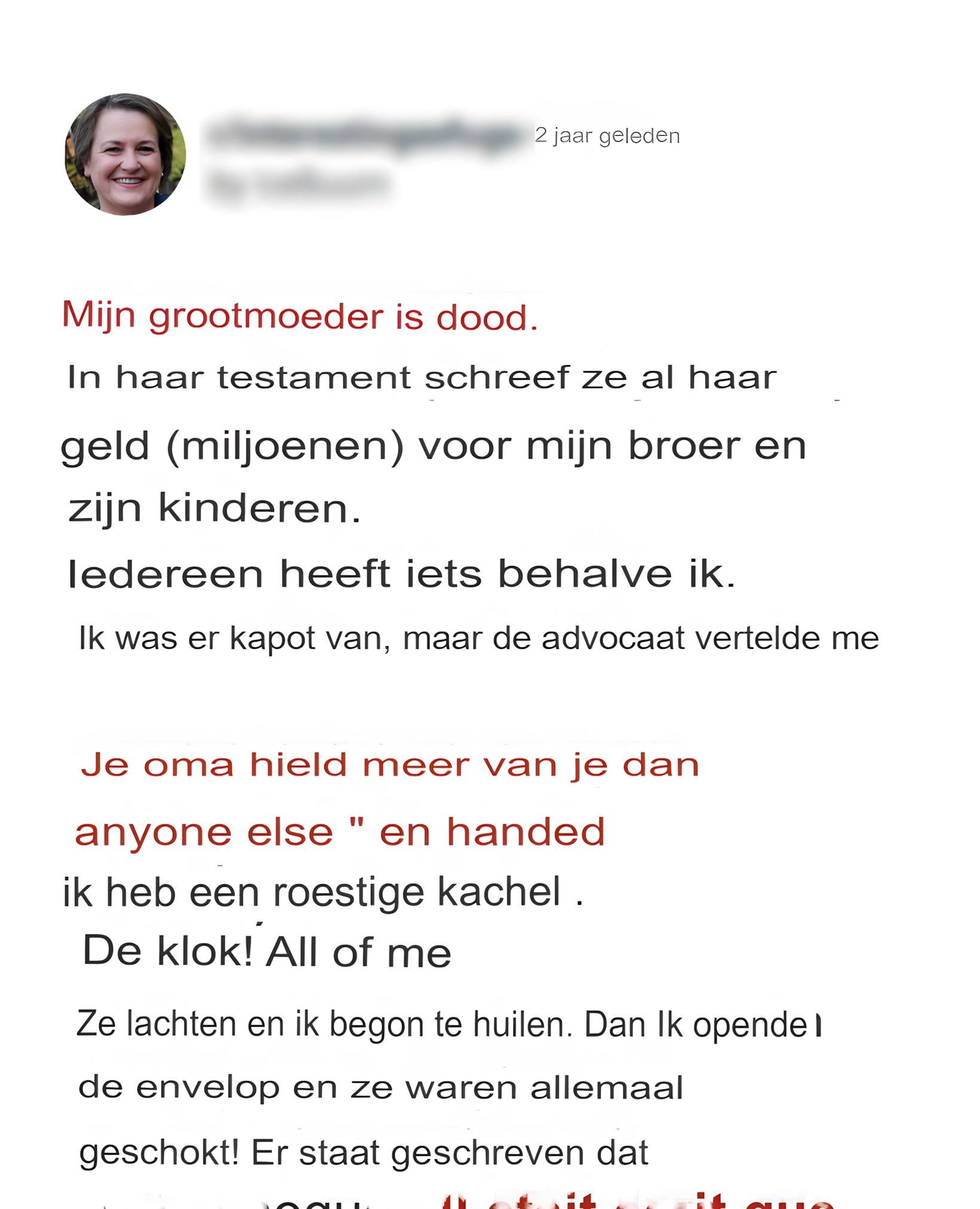 Ze is net uit de taxi gestopt. Angst vulde haar ogen, maar haar hart zei: ‘Er zal oma niets overwinnen.’ Het komt goed. Ze zal nog honderd jaar leven.