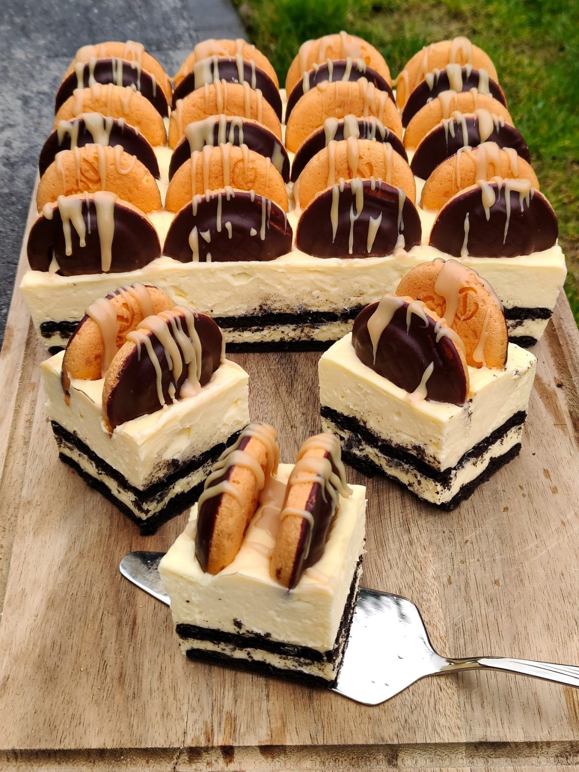 (Ik heb een glas van 250 ml gebruikt om de ingrediënten af te meten. Ik heb de taart in een bakvorm van 24×24 cm bereid. Voor de taart heb ik een sinaasappelsmaak gebruikt, maar het is beter om koekjes in jouw favoriete smaak te kiezen.)