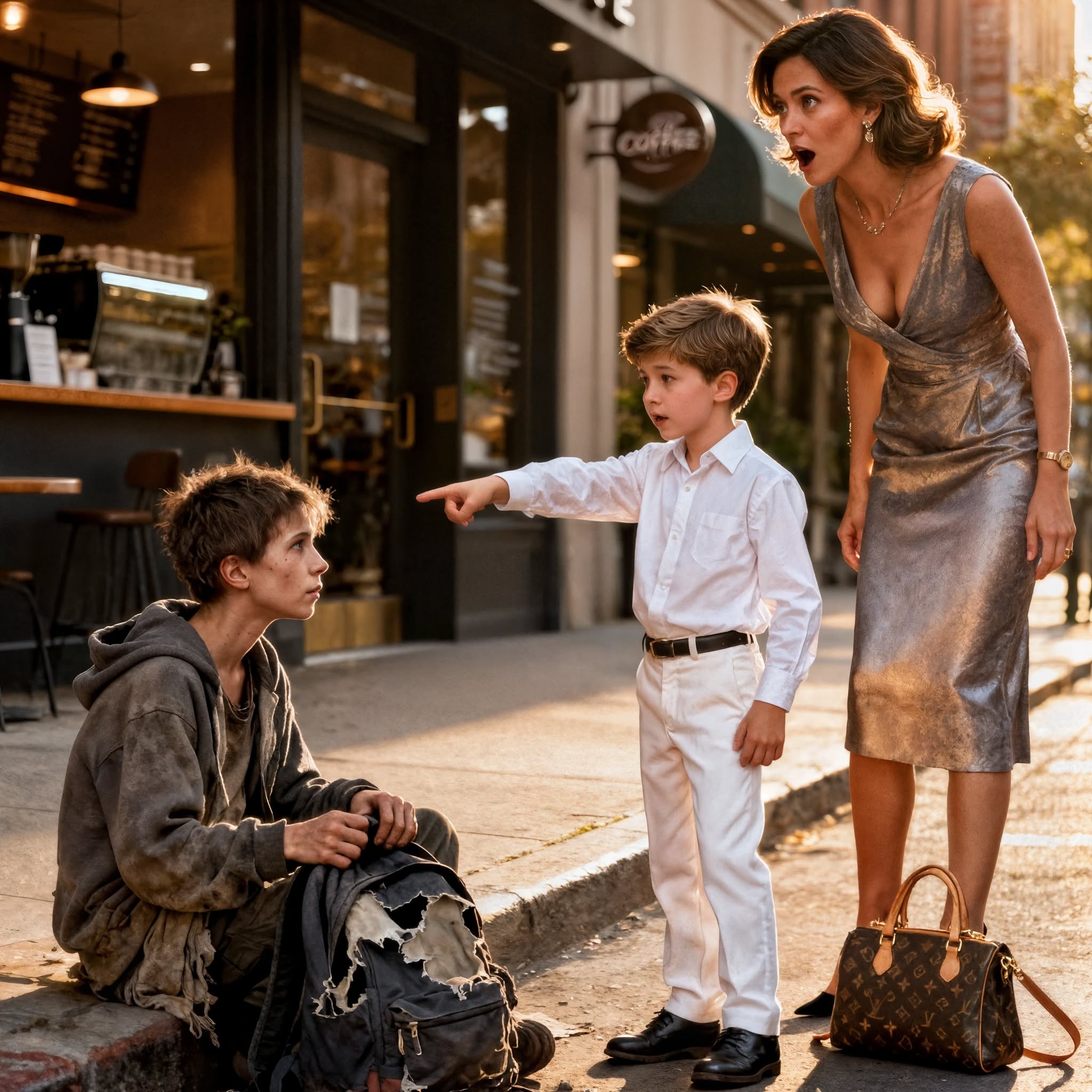 Aan de overkant van de straat, vlakbij de hoek van een bakker, zat een jongetje ineengedoken onder een kapotte paraplu. Zijn kleren waren doorweekt, zijn haar zat in de klit en plakte aan elkaar. Hij at wat er nog over was in een weggegooid broodpapiertje. Ondanks het vuil was er iets aan hem dat vreemd vertrouwd was: dezelfde diepbruine ogen, dezelfde kuiltjes in zijn kin, dezelfde zachte welving van zijn mond.