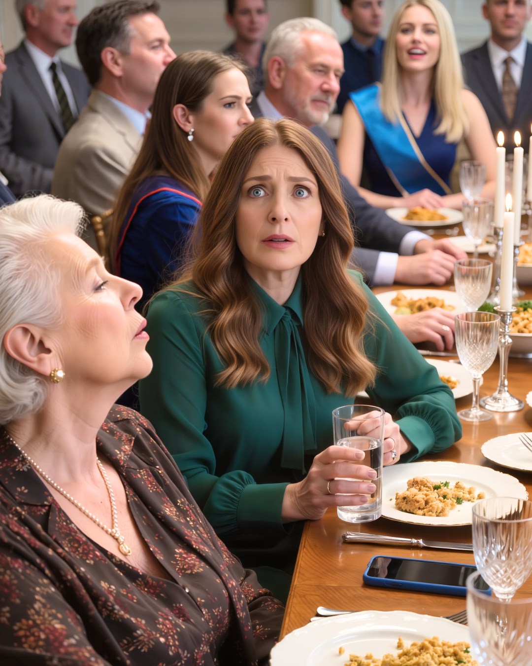 De privé-eetzaal gonsde van het zachte gekletter van bestek en het gedempte gemurmel van gesprekken, het soort verfijnde, weloverwogen geluid waar restaurants extra voor rekenen. Kleine, goudkleurige lampjes hingen boven de tafel en wierpen een flatterende gloed op de wijnglazen, het gepolijste bestek en de zorgvuldig gearrangeerde tafelstukken met witte rozen en eucalyptus.
