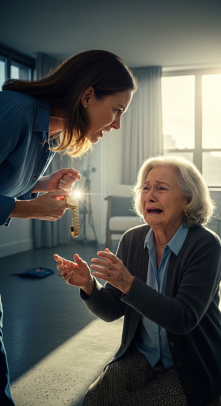 ‘Dus wat als we zijn Rolex zouden verkopen, Leo? Hij was toch verrot. Het was het enige dat hij achterliet. En haar?’ – een minachtende pauze. « Ze is gewoon een waardeloze oude heks. »