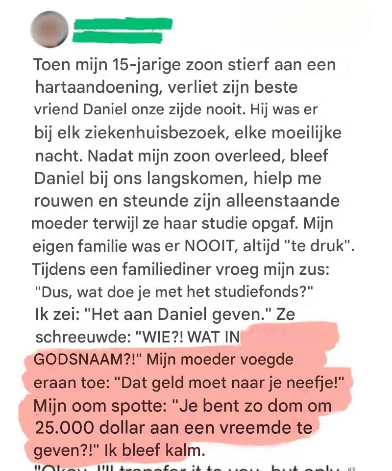 « Die gast uit het ziekenhuis? » vroeg mama. « Schatje, dat geld moet binnen de familie blijven. »
