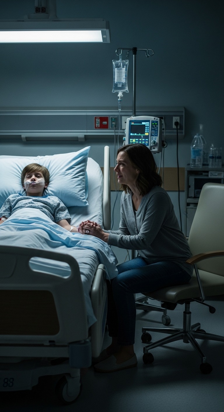 De verpleegster kwam hem om 6:02 uur ophalen om hem naar de operatiekamer te brengen. Oliver klemde zich vast aan mijn hand, zijn moed brokkelde eindelijk af. De tranen stroomden over zijn bleke gezicht. « Mam, ik ben bang. »