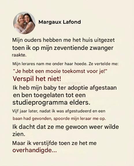 Er zijn momenten waarop alles zonder waarschuwing verandert, alsof de grond onder je voeten wegzakt. Op haar zeventiende dacht Élise dat ze het dieptepunt had bereikt, alleen en geconfronteerd met een situatie die te zwaar was om te dragen. Wat ze toen nog niet wist, was dat een simpele, vriendelijke blik haar val zou veranderen in een nieuw begin… en dat het grootste geschenk pas veel later zou komen.
