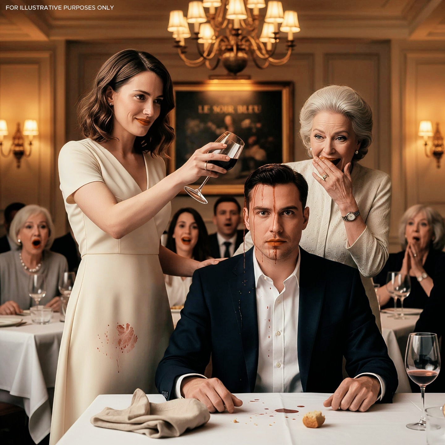 Mark pakte de fles en begon te schenken. Zodra de ober zich omdraaide, gooide hij hem « per ongeluk » te ver over de rand – en een waterval van rode wijn stroomde langs mijn jurk.