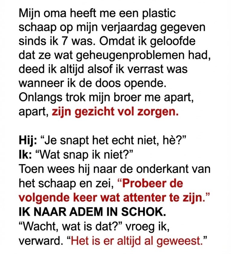 Ze keek altijd zo trots toe hoe ik het openmaakte, alsof de schaapjes iets bijzonders waren. Maar voor mij waren het gewoon… schaapjes. Van plastic en simpel.
