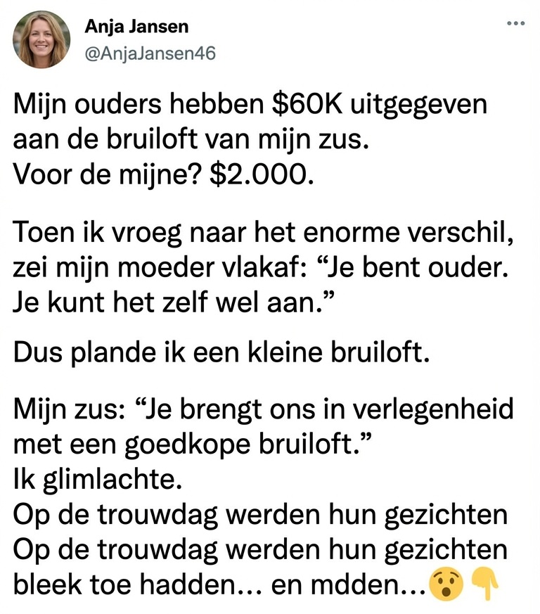 Toen mijn ouders bijna zestigduizend dollar uitgaven aan de bruiloft van mijn zus, was ik oprecht blij voor haar. Ik heb het planningsproces achttien maanden lang van dichtbij meegemaakt: de pasbeurten voor de designerjurk, de proeverijen bij de chique cateraars, de discussies over bloemstukken die meer kostten dan de maandelijkse huur van de meeste mensen. Ik hielp met het adresseren van de uitnodigingen, ging naar het vrijgezellenfeest en stond naast haar als bruidsmeisje in een jurk van vierhonderd dollar die ik precies één keer heb gedragen.