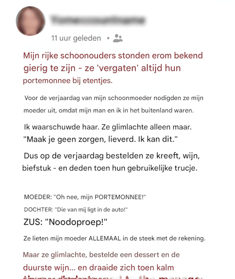 Meestal was het mijn man. Soms een oom. Soms een vriend die toevallig mee was. Het gebeurde zo vaak dat het een patroon werd. En ik, ik had er een hekel aan. Niet eens alleen om het geld, maar om het gebrek aan respect. Om het vanzelfsprekende idee dat hun luxe maaltijd door een ander betaald mocht worden.