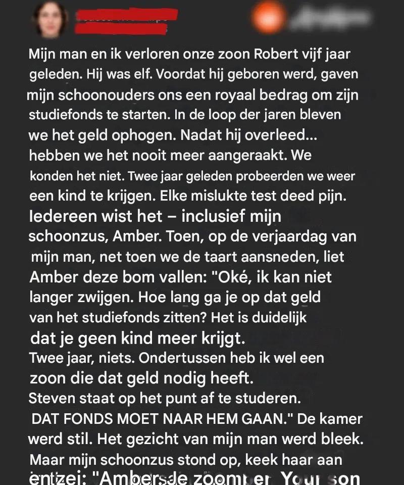 Toen Clara’s schoonzus een buitensporige eis stelde tijdens wat een rustig familiefeest had moeten zijn, kwam het verleden brullend terug. Verdriet botste met woede, en in die kwetsbare ruimte waar herinnering en nalatenschap elkaar ontmoeten, werd Clara gedwongen de naam van haar zoon te verdedigen – en de grens te trekken tussen oprechte liefde en veeleisende verwachtingen.