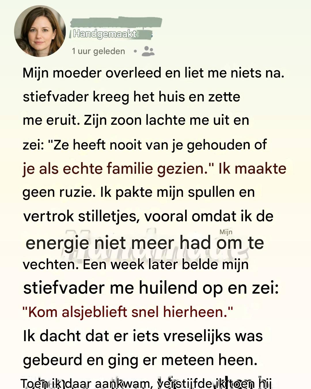 Toen mijn moeder stierf, was de stilte in huis oorverdovend. Ik had verdriet verwacht, maar geen verraad. Het testament liet me niets na – geen huis, geen aandenken, zelfs geen kleinigheid. Mijn stiefvader erfde alles en met kille vastberadenheid zei hij dat ik moest vertrekken. Zijn zoon stond grijnzend in de deuropening en sprak woorden uit die dieper sneden dan welk mes ook: « Ze heeft nooit van je gehouden en je nooit als echte familie gezien. »
