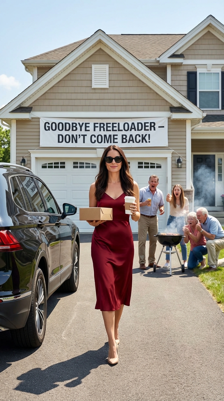 Ik maakte geen ruzie. Ik schreeuwde niet. Ik gaf ze niet de voldoening van een enkele traan. Ik liep het huis in, door de wasruimte, en pakte mijn laatste doos. Op weg naar buiten bleef ik even staan. Ik pakte mijn telefoon en maakte een scherpe, heldere foto van het spandoek met mijn vader en oom eronder, grijnzend als jagers die poseren met hun buit.