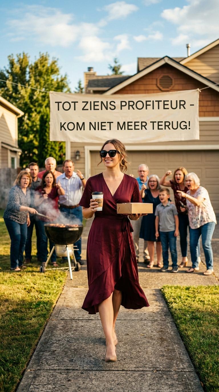 Ik maakte geen ruzie. Ik schreeuwde niet. Ik gaf ze niet de voldoening van een enkele traan. Ik liep het huis in, door de wasruimte, en pakte mijn laatste doos. Op weg naar buiten bleef ik even staan. Ik pakte mijn telefoon en maakte een scherpe, heldere foto van het spandoek met mijn vader en oom eronder, grijnzend als jagers die poseren met hun buit.